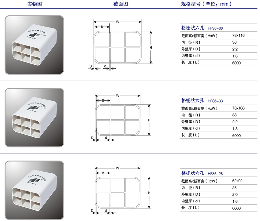 通信用PVC六孔栅格管采用优质耐老化改良PVC工程塑料一次挤出,抗压强度高,独特的多孔一体力学支撑结构,显著提高管材的抗压能力,使管材比普通结构塑料管材抗压性能高10~100倍,正常情况无须做基础或包封,防沉降,能代替钢管安全穿越马路,阻燃(离火即熄性好),抗腐蚀,耐老化,埋地使用寿命长达50年以上。