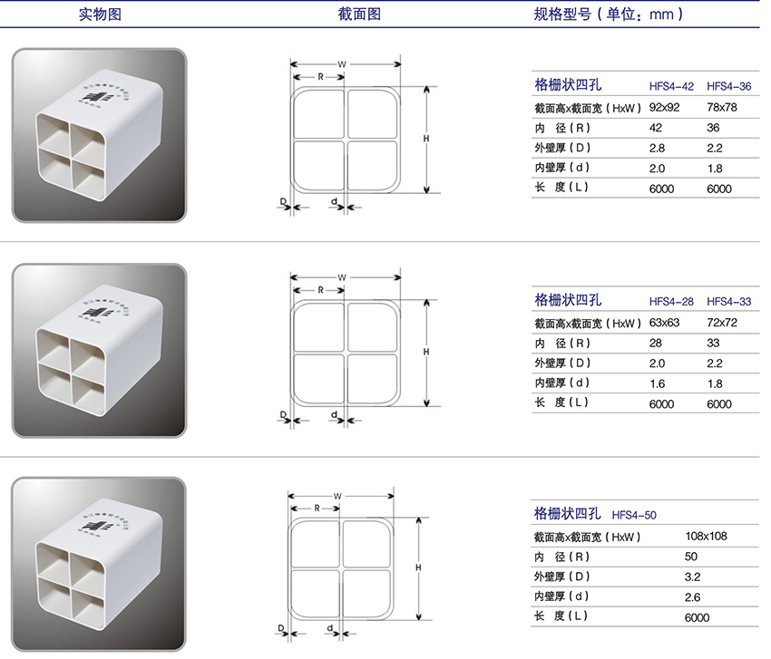 通信用PVC四孔栅格管采用优质耐老化改良PVC工程塑料一次挤出,抗压强度高,独特的多孔一体力学支撑结构,显著提高管材的抗压能力,使管材比普通结构塑料管材抗压性能高10~100倍,正常情况无须做基础或包封,防沉降,能代替钢管安全穿越马路,阻燃(离火即熄性好),抗腐蚀,耐老化,埋地使用寿命长达50年以上。
